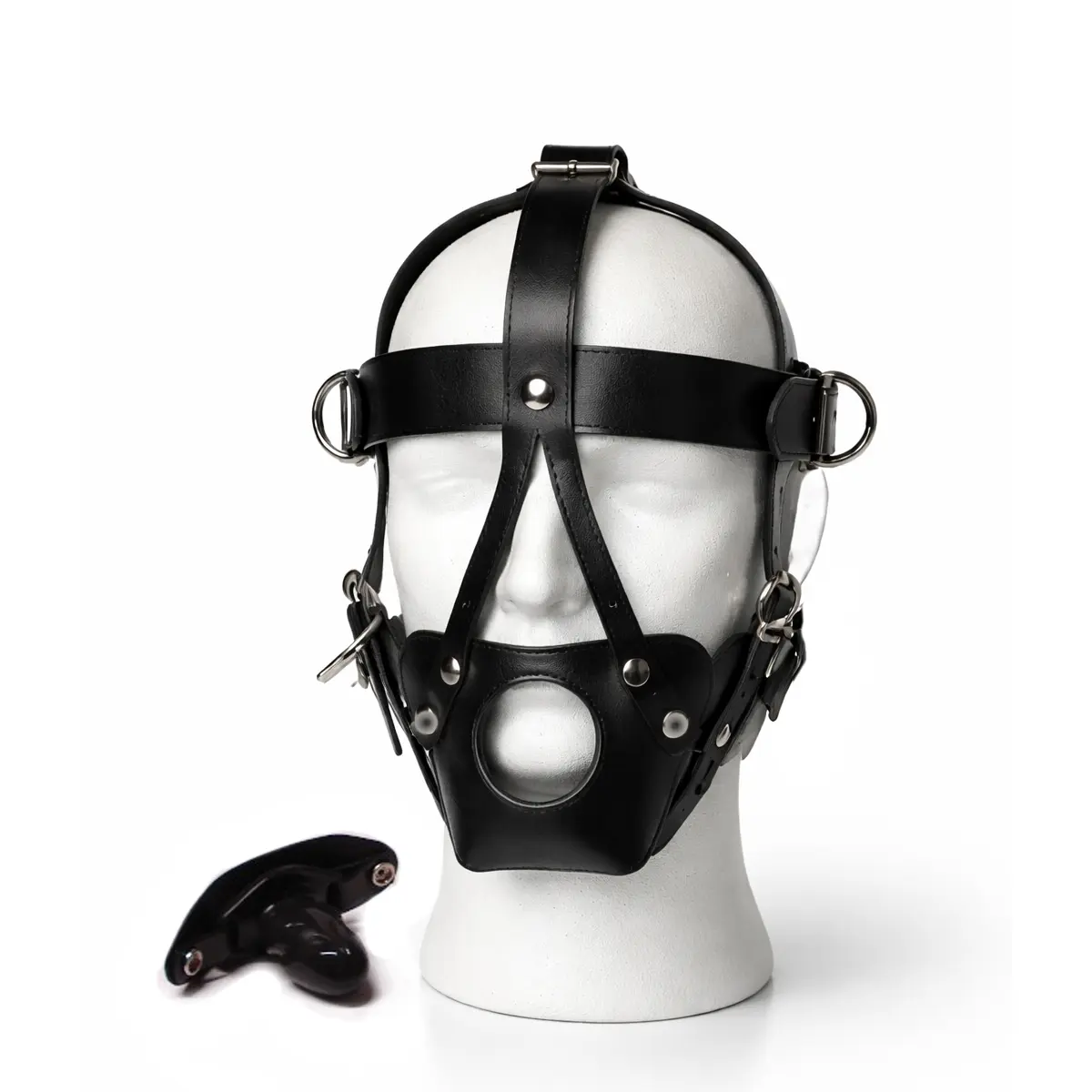 Kopfmaske als Harness aus schwarzem Leder mit abnehmbarem Mundknebel aus Silikon. Die breiten kantenfreien Riemen lassen sich durch insgesamt acht Riemenverschlüsse individuell anpassen. Fünf eingearbeitete D-Ringe, die sehr hochwertige Verarbeitung und der abnehmbare Knebel machen diese S/M-Maske zu einem ganz besonderen Toy!