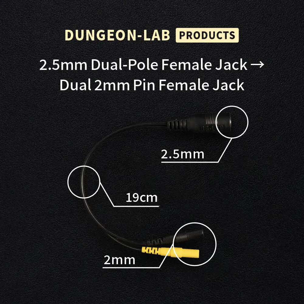 Anschlussadapter Dungeon-Lab von 2,5 mm Klinkenbuchse (zweipolig) zu 2 x 2 mm Pinbuchsen (jeweils einpolig), mit 19 cm Kabelverbindung zum Anschluss von Zubehör an ein Reizstromgerät.