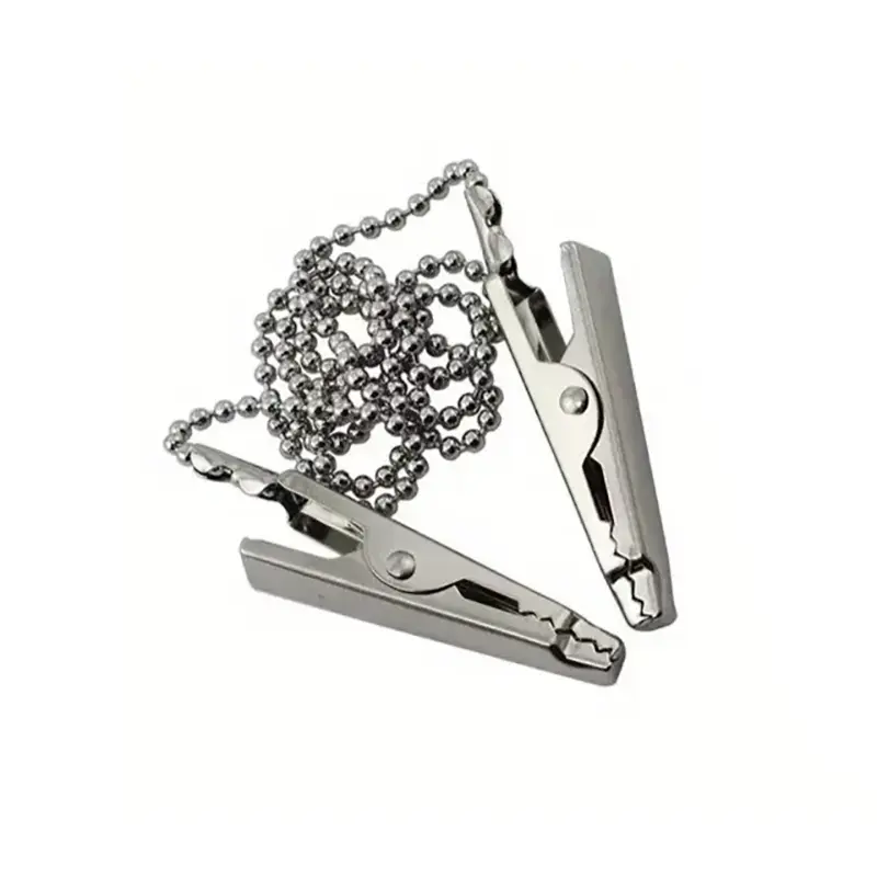 Zwei Brustwarzenklemmen aus Metall mit gezahnter Klemmfläche, mattglänzend, verbunden mit einer ca. 30 cm langen Metallkette