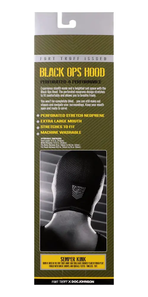 Experience intense headspace play with the Fort Troff Black Ops Hood, which offers maximum breathability and a comfortable fit thanks to perforated neoprene. The flexible material fits snugly, while the slight transparency allows for a sense of orientation—without losing the thrill of restriction. The generous mouth opening ensures optimal freedom.